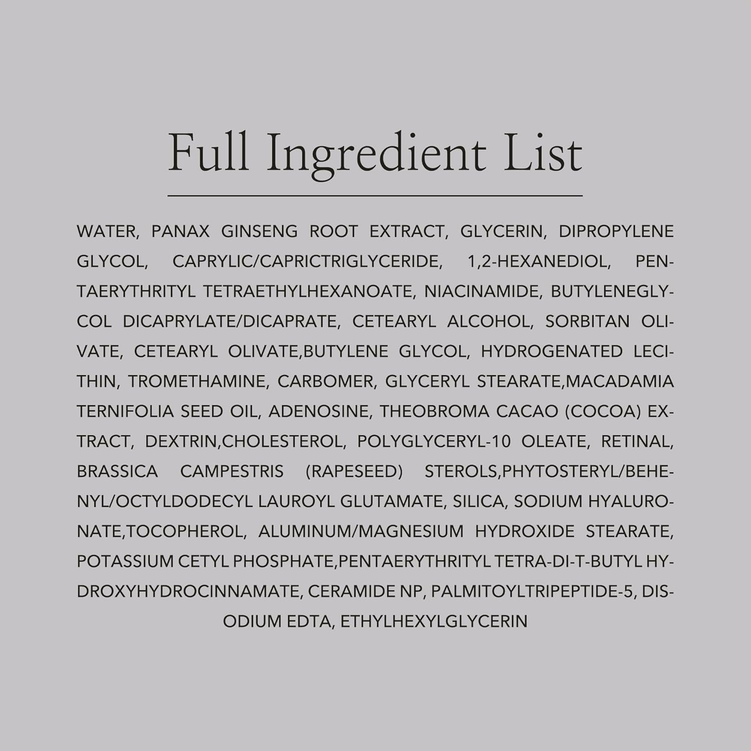 - Key Ingredients: Ginseng Extract for skin elasticity and protection, Retinal for reduction of wrinkles and Niacinamide for brightness
