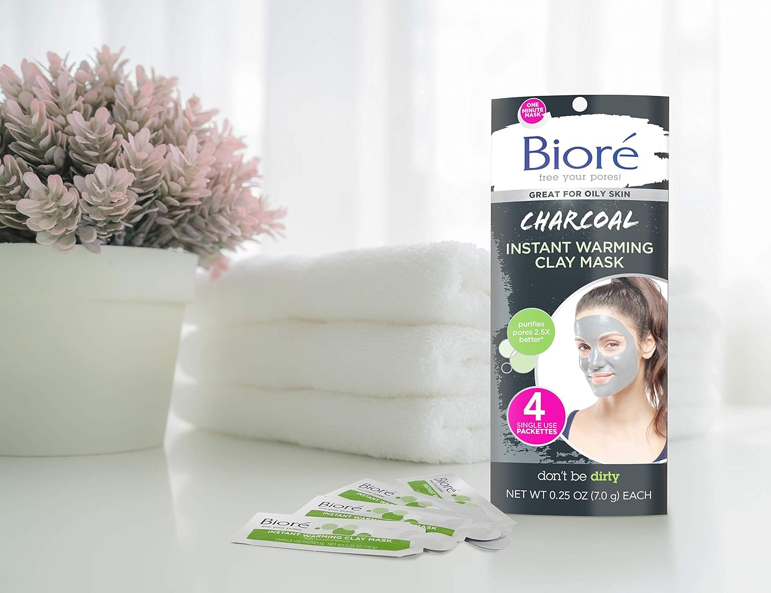 Bioré Charcoal Instantly Warming Clay Facial Mask for Oily Skin, with Natural Charcoal, Cleanse Clogged Pores, Dermatologist Tested, Non-Comedogenic, Oil Free,1 Pack (4 Count)
