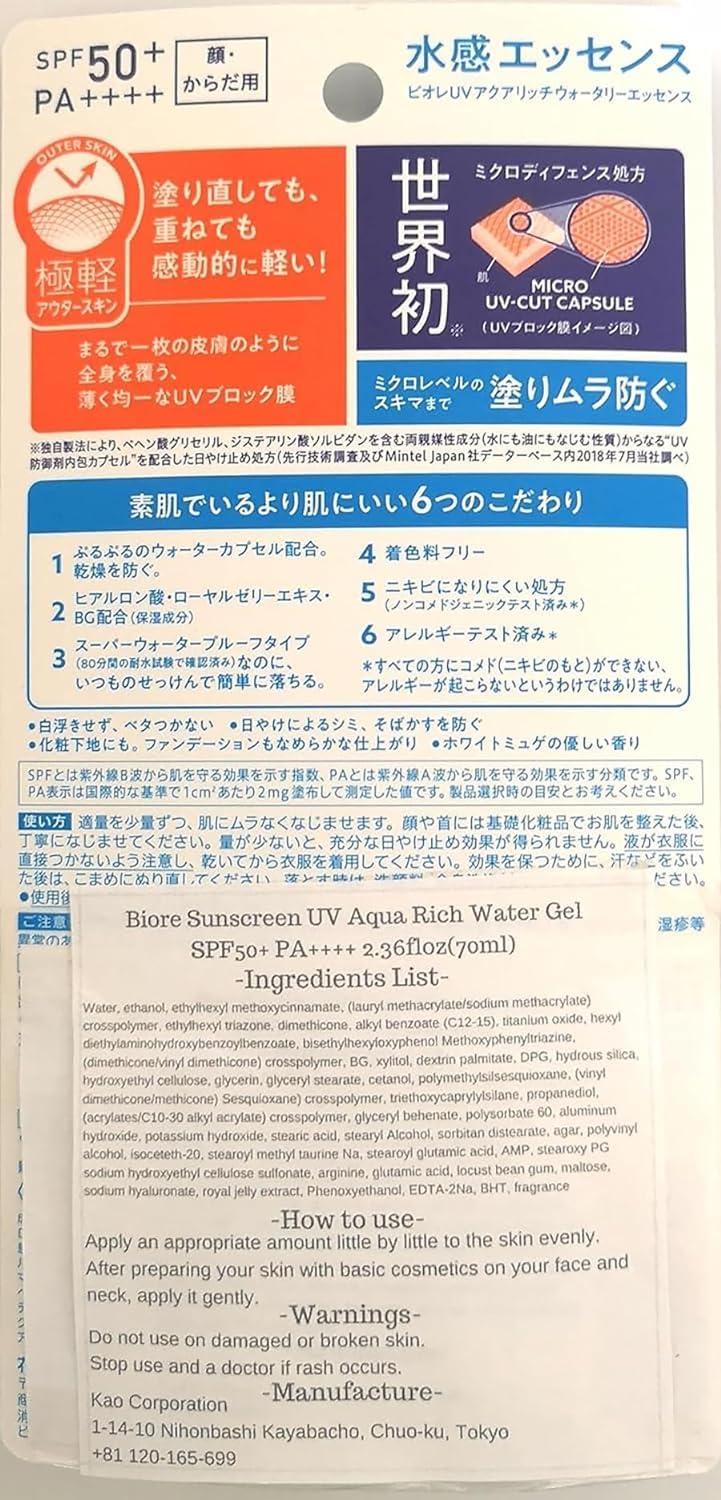 Japanese Kao UV Aqua Rich Sunscreen Water Essence SPF50 PA 3.70floz(105g) Set Of 2