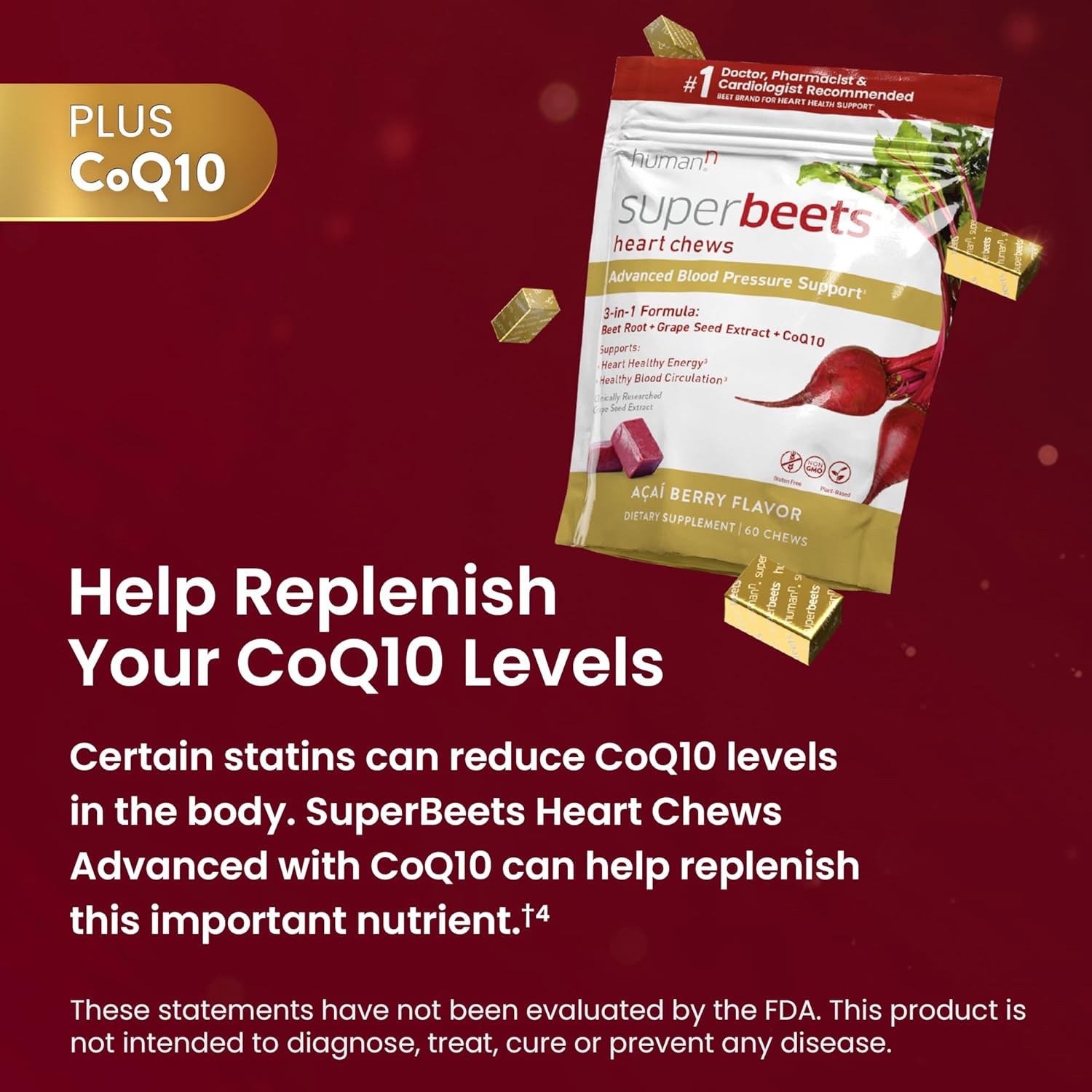 - COQ10 Support: Cholesterol-lowering statins, age, and stress can cause a decline in CoQ10 levels, an antioxidant your body uses to generate 95% of the cellular energy your heart needs. SuperBeets Heart Chews Advanced may help replenish CoQ10