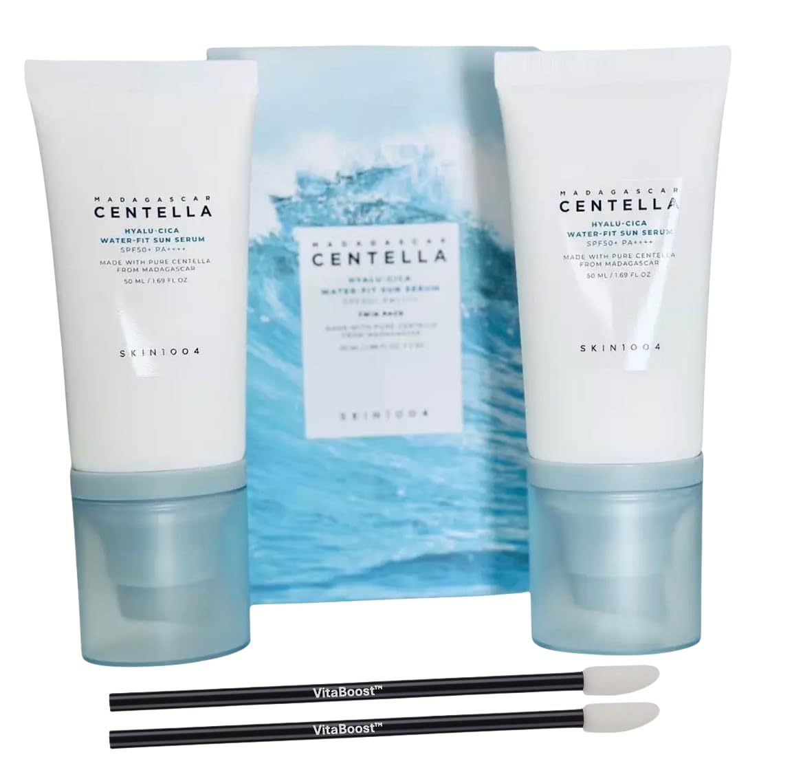 Hyalu CICA Water-fit Sun Serum 50 ML (Pack of 2) provides ultimate protection and hydration in a lightweight, non-greasy formula. Enriched with Hyaluronic Acid and Centella Asiatica (CICA), this sun serum not only shields your skin but also soothes and moisturizes sensitive skin. With protection and a fast-absorbing texture, this serum leaves your skin feeling soft and hydrated without any sticky residue, making it ideal for daily use. The pack of two ensures you’re always prepared for the day, whether at home or on the go. Included are VitaBoost Application Brushes that are designed for a flawless and seamless application. This premium brush set includes ultra-soft pads that are gentle on your skin while ensuring precise and even application of foundation, lotions, serums, powder, and more. Durable and easy to clean, these applicators are perfect for both beginners and professionals. Enhance your beauty routine with these versatile and high-quality applicators that make application smooth and effortless.