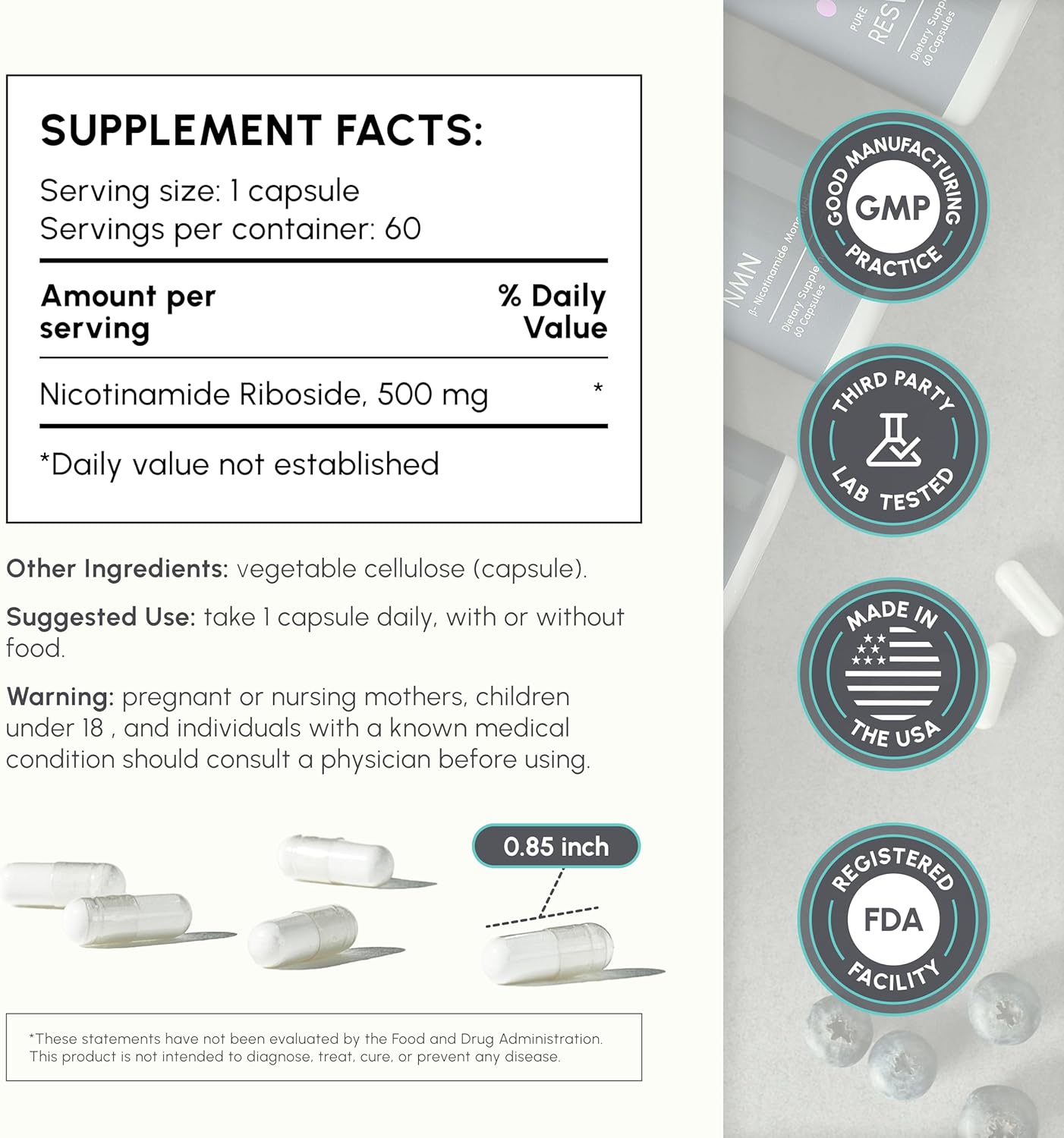 Nicotinamide Riboside (NR) 500mg – NR Supplement for Cellular Health, Anti-Aging, Energy & Metabolism Support – 2-Month Supply (60 Capsules)